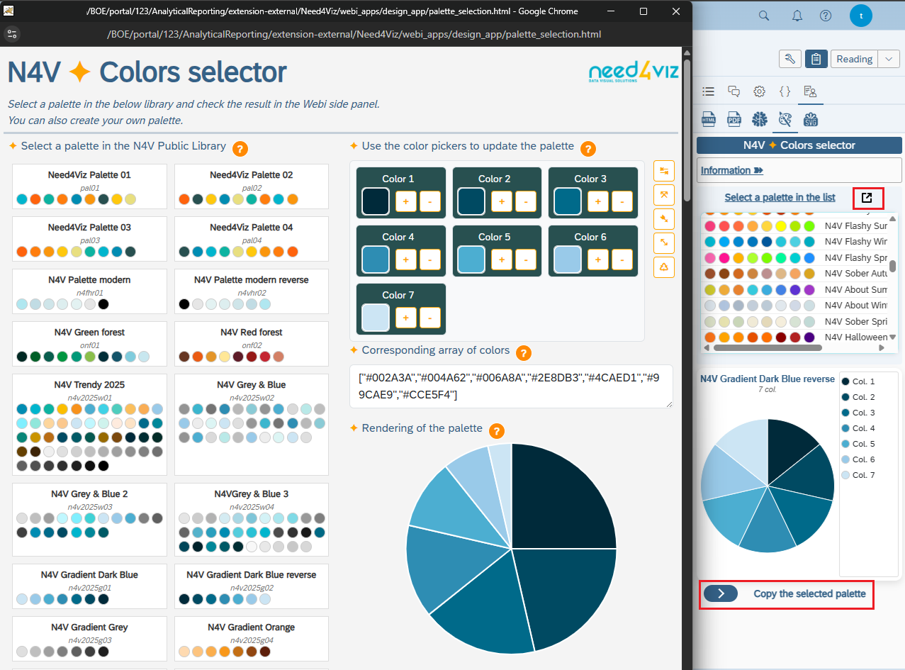 - Vous pouvez sélectionner l'une de ces palettes pour l'appliquer à votre élément N4V ou utiliser l'outil Palette N4V en cliquant sur le bouton « popup ».