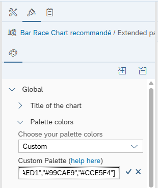 - Dans Global/Palette, sélectionnez « Personnalisée » en bas de la liste, collez la palette précédemment copiée dans le champ « Palette personnalisée » correspondant et appliquez.
