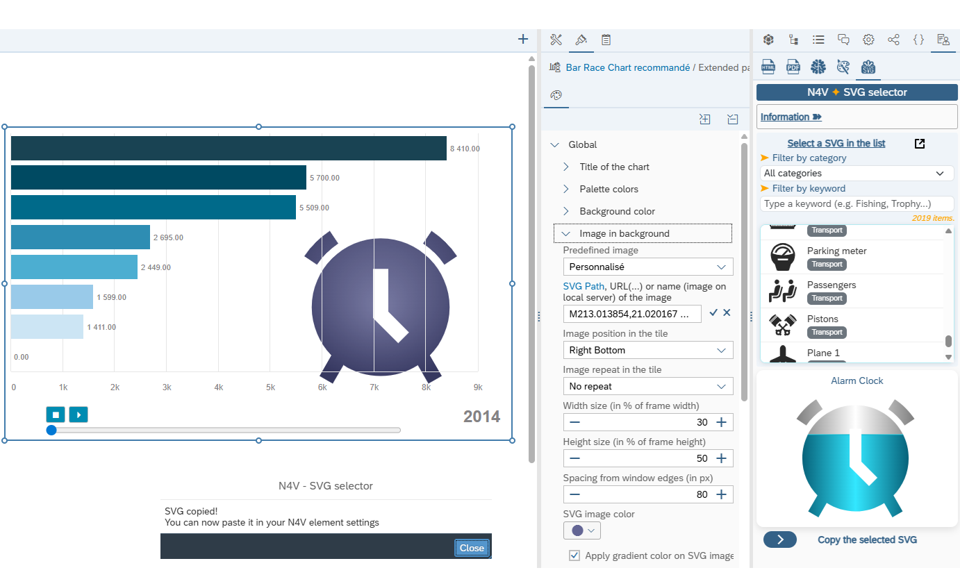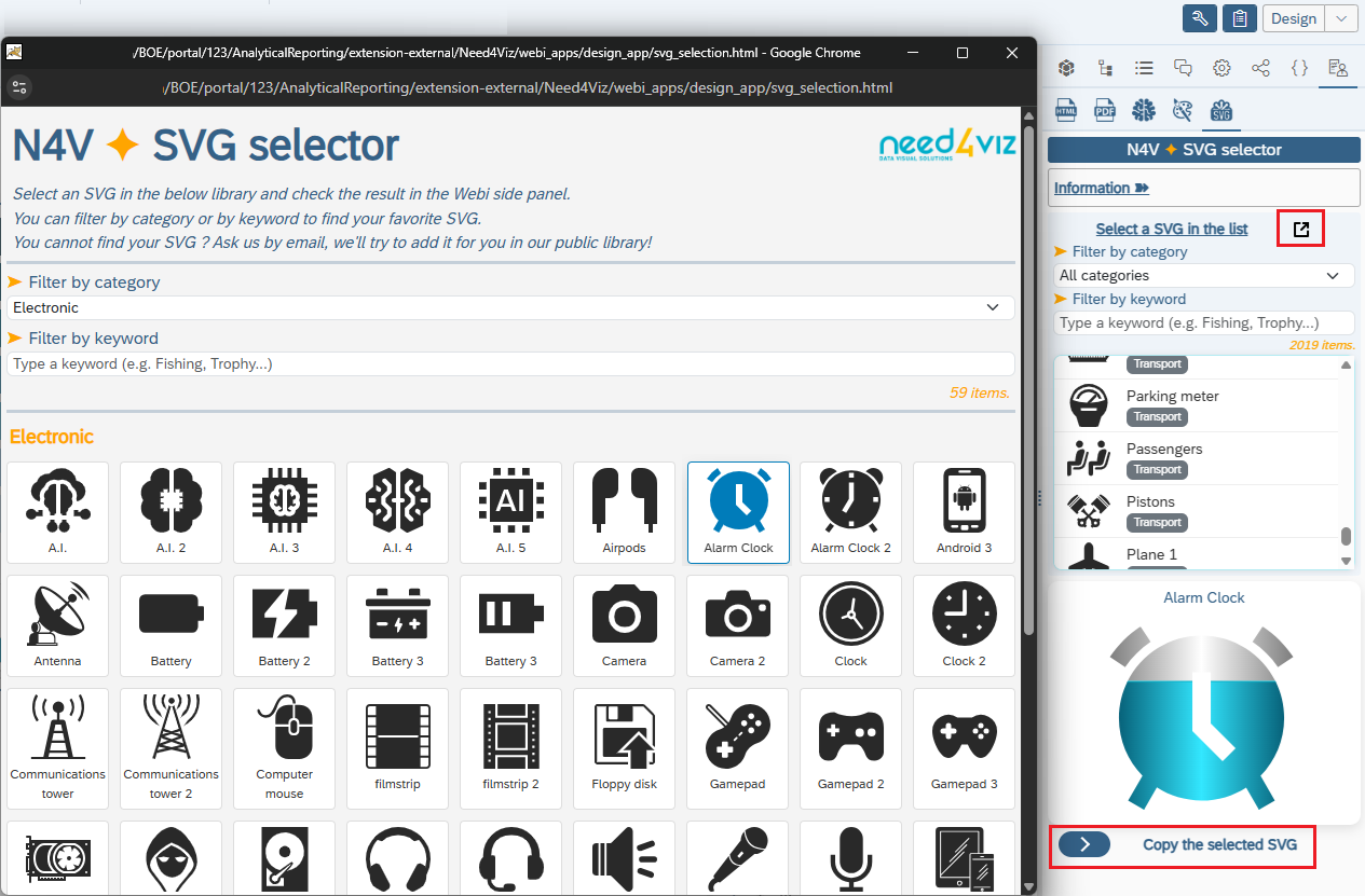 - Vous pouvez sélectionner un SVG pour l'appliquer à votre élément N4V ou utiliser l'outil SVG N4V en cliquant sur le bouton « popup ».