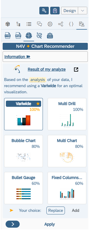 The Designer extension give the Webi designer the access to the Chart Recommender, the N4V SVG tool and the N4V Palette tool (to customize all his N4V charts).