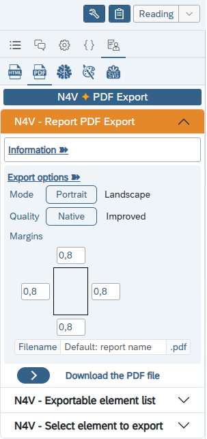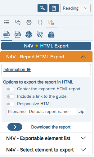 The User extension give the user the ability to download on his computer, in full HTML and/or PDF, the current report page (or a specific /selected N4V element).
